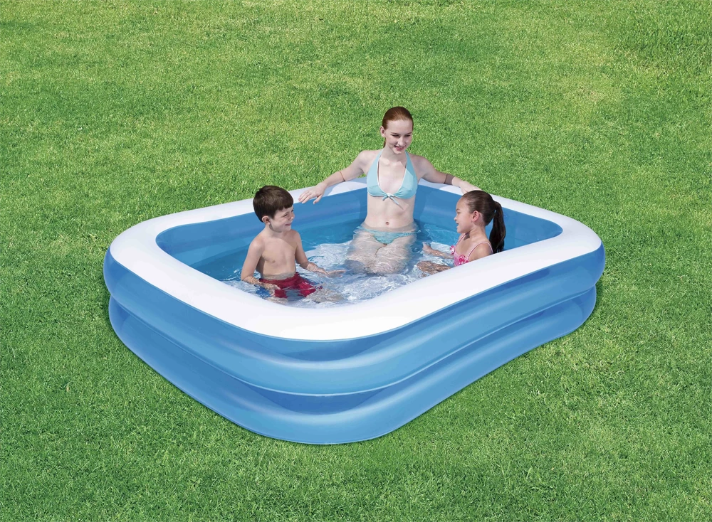Het Bestway opblaasbad is gemaakt van stevig vinyl en bestaat uit 2 brede ringen in een rechthoekige. Het familiezwembad is voorzien van extra brede randen en daardoor geschikt voor kinderen vanaf 6 jaar en ouder, mits er toezicht is van een volwassene. Je blaast het zwembadje binnen de kortste keren op en laat deze ook gemakkelijk weer leeglopen via de handige aftapplug. In het opblaaszwembad gaat een maximale inhoud van 400 liter water.