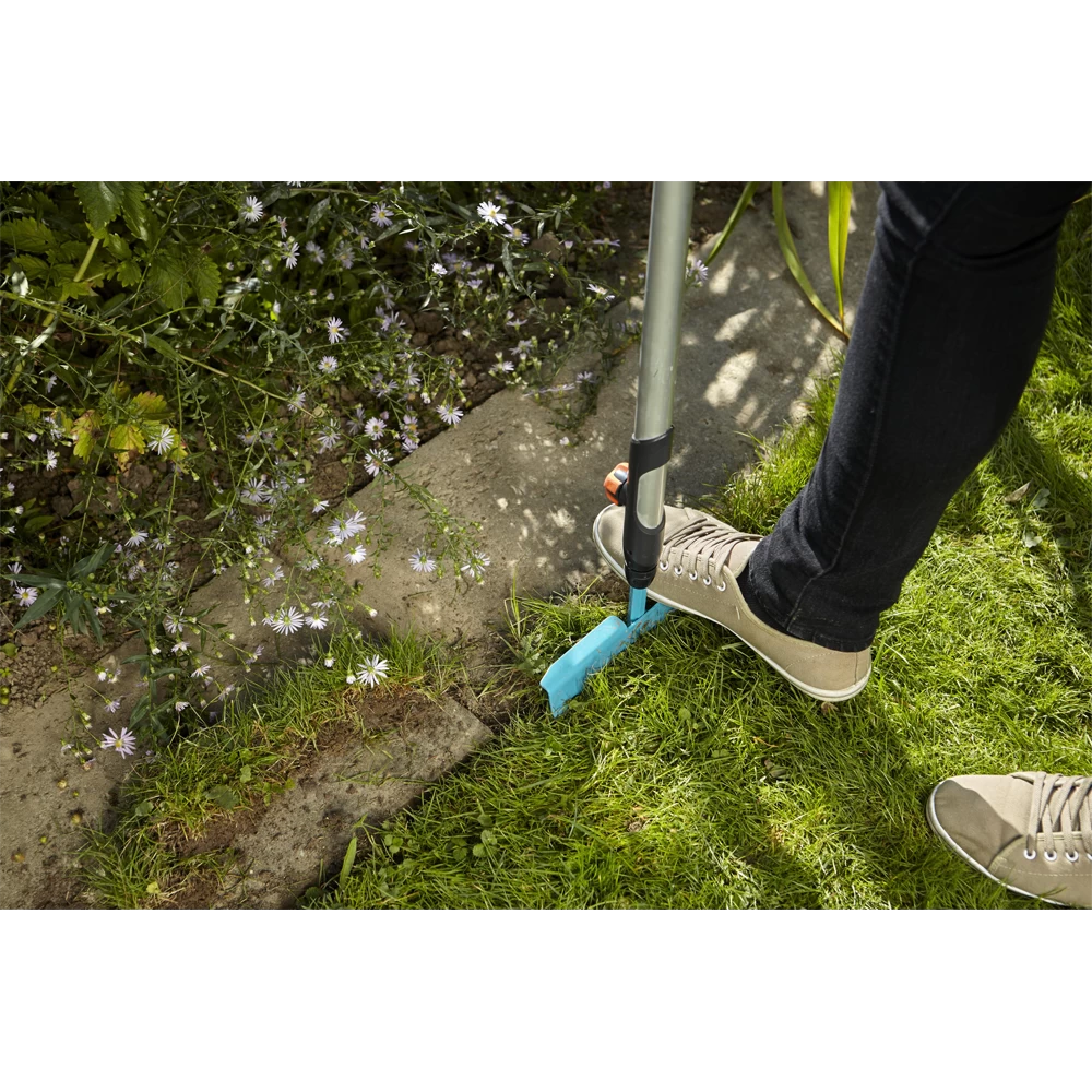 De GARDENA combisystem-graskantafsteker is uitermate geschikt om de rand van het gazon recht af te steken, zodat bloemperken duidelijk zijn afgescheiden van het gazon. Met de scherpe en geharde stalen rand in de vorm van een halve maan is dit heel eenvoudig. De graskantafsteker is geschikt voor alle stelen van het GARDENA combisystem, waarbij GARDENA een steellengte van 130 cm adviseert, afhankelijk van uw lichaamslengte.