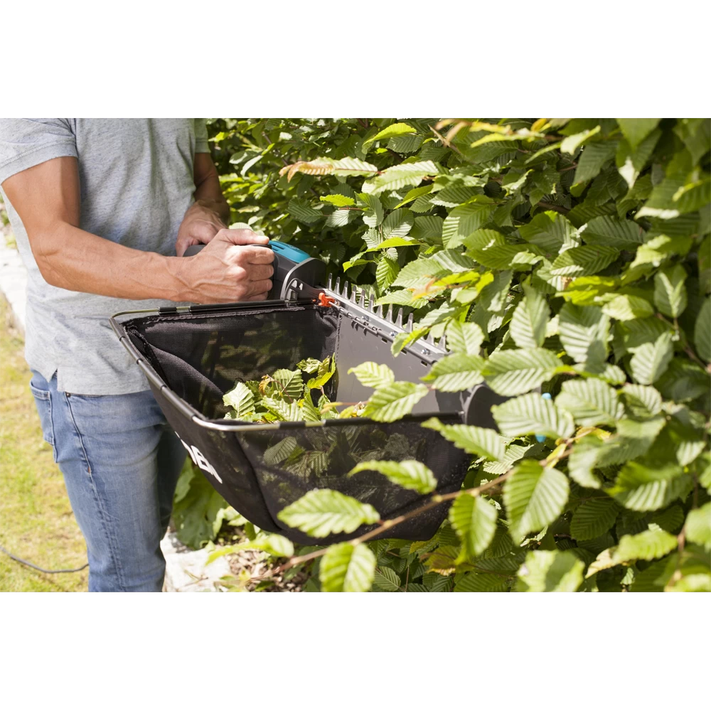 Gebruik deze GARDENA Cut&Collect opbergtas om stekken direct op te vangen tijdens het snoeien van de heg. De opvangzak is eenvoudig aan te sluiten om het blad van de heggenschaar. Het verzamelen en opruimen van stekken kost daardoor nauwelijks meer tijd. De opvangzak is geschikt voor verschillende bladlengtes en kan gemakkelijk gedraaid worden om te legen. Geschikt voor elektrische GARDENA EasyCut heggenscharen (niet geschikt voor heggenscharen op accu).