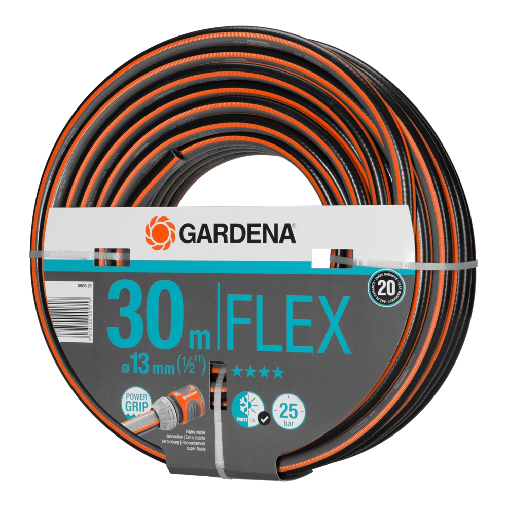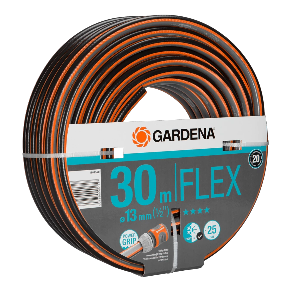De GARDENA Comfort FLEX slang met Power Grip profiel staat garant voor de perfecte verbinding tussen slang en slangstuk. Dankzij de nieuwe technologie, grijpen ze in elkaar als tandwielen. Het Power Grip profiel vervult de wens van veel tuinbezitters: een betrouwbare verbinding met optimaal houvast. Een positief neveneffect van het verhoogde profiel: De slang is makkelijker op te rollen en glijdt goed. Dankzij het spiraalweefsel textiel met twee spiralen die werken in tegengestelde richtingen, is de slang drukbestendig en vormvast, maar ook flexibel en gemakkelijk te hanteren. Raakt niet in de knoop en verdraait niet. Dit zijn de beste voorwaarden voor een comfortabel en flexibel gebruik in uw tuin. Indien gewenst, systematisch uit te breiden met Original GARDENA System koppelstukken en besproeiingsproducten. De slang is vrij van schadelijke weekmakers (ftalaten ) en zware metalen, en is natuurlijk UV-bestendig. De dikke wanden maken de slang bijzonder robuust en duurzaam. Barstdruk: 25 bar.