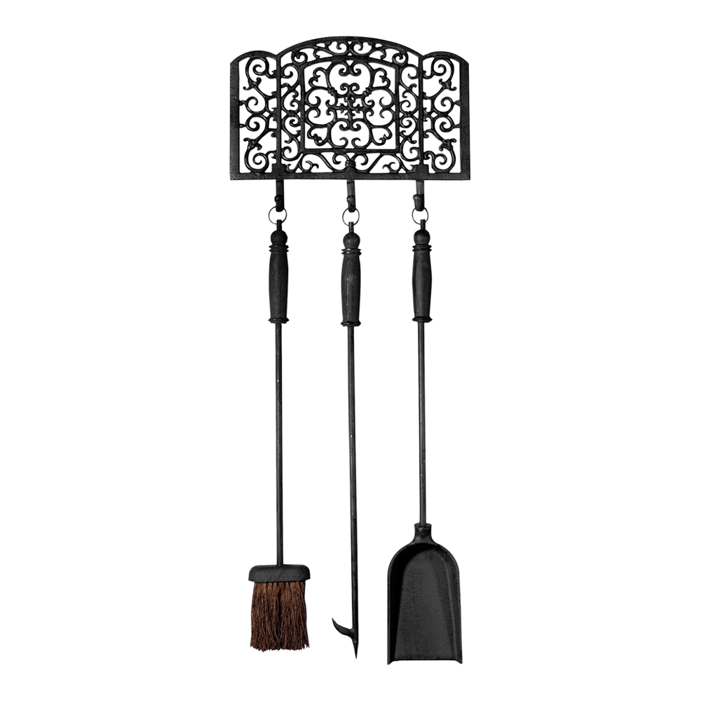 Wat is er gezelliger dan tijdens koude avonden het geluid te horen van een knisperend haardblok. Deze klassieke haardgereedschapset bestaat uit drie stuks gereedschap en een muurhouder met sierlijke krullen. Bij deze set worden een schep, een pook en een bezem geleverd, dit om de haard optimaal te kunnen onderhouden. Het gereedschap is ideaal voor het opruimen en schoonmaken van de haard. De gietijzeren onderdelen zijn met de hand gegoten volgens eeuwenoud vakmanschap en traditie.