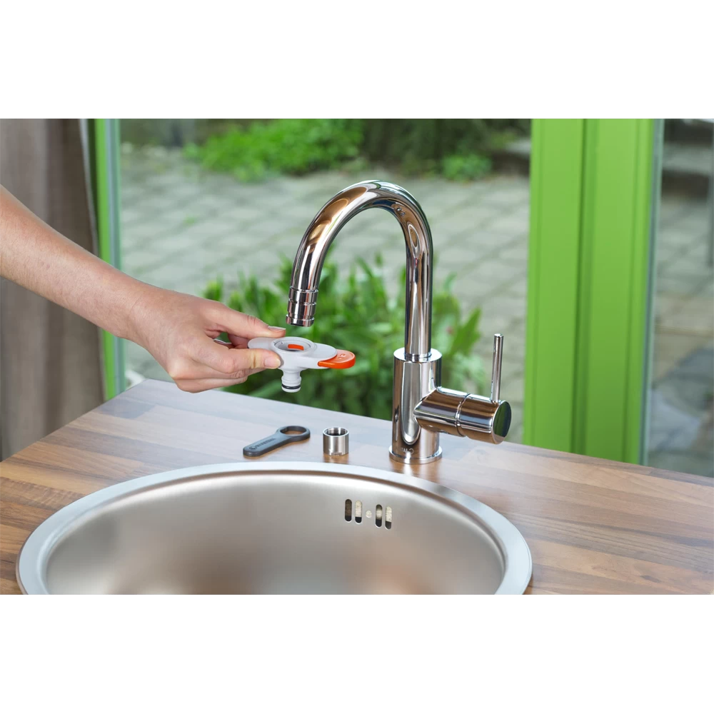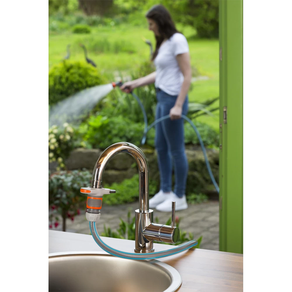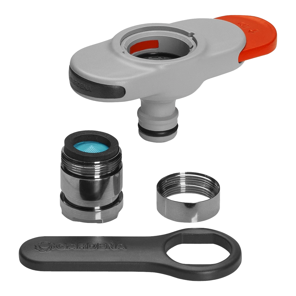 De kraanaansluiting voor binnenkranen van GARDENA maakt water geven op balkon en terras heel makkelijk. U hoeft niet meer met een gieter op en neer te lopen. De adapter aan de kraan bevestigen kan in slechts een paar eenvoudige stappen. Het aandraaien van de draad is kinderspel met de meegeleverde sleutel. Plaats vervolgens de adapter op het draad en druk op de schuifregelaar. Verschuif hem om de adapter aan het draad te bevestigen. Zodra dat is gebeurd, kan een slang worden bevestigd. Als u de schuifregelaar in de tegenovergestelde richting beweegt, wordt de adapter losgemaakt en kan deze gemakkelijk worden verwijderd. De adapter is compatibel met alle conventionele kranen met M 24 x 1 binnen- of M 22 x 1 buitendraad (niet geschikt voor niet onder druk staande of lage druk boilers). De kraanaansluiting is een essentieel accessoire voor binnenkranen voor grote hoeveelheden water, bijvoorbeeld om het aquarium of peuterbadje te vullen.