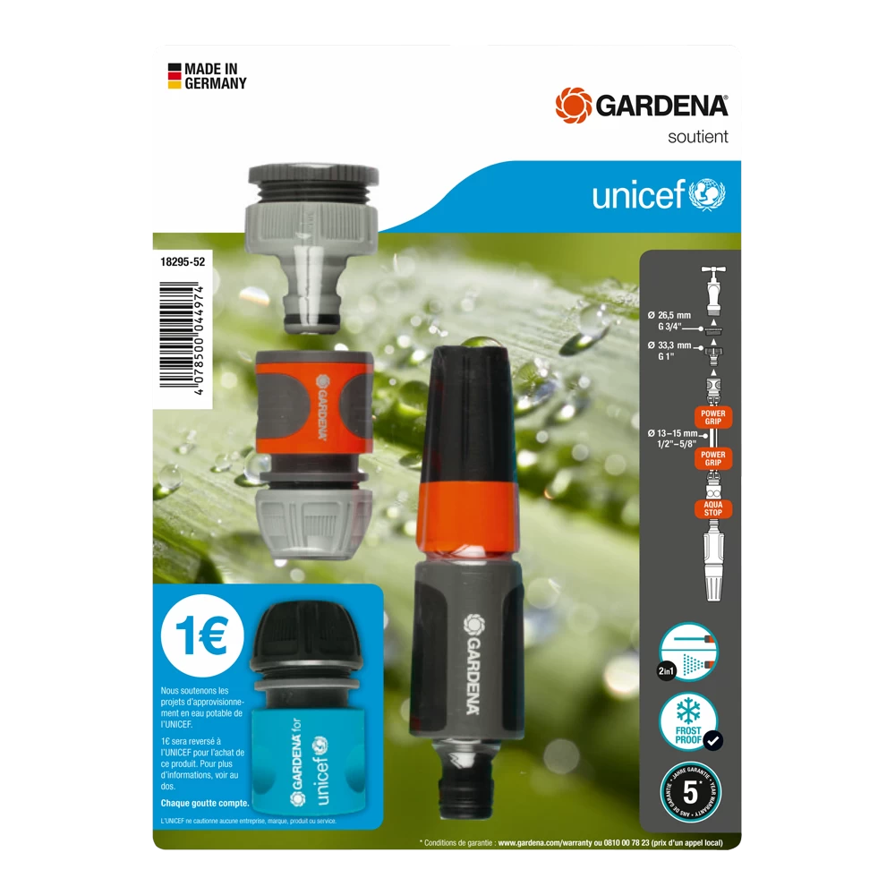 De GARDENA basisset bevat een kraanstuk met adapter (art.nr. 18202 en 5305), een slangstuk (art.nr. 18215), een aquastop (art.nr. 18213) en een Classic tuinspuit (art.nr. 18300).