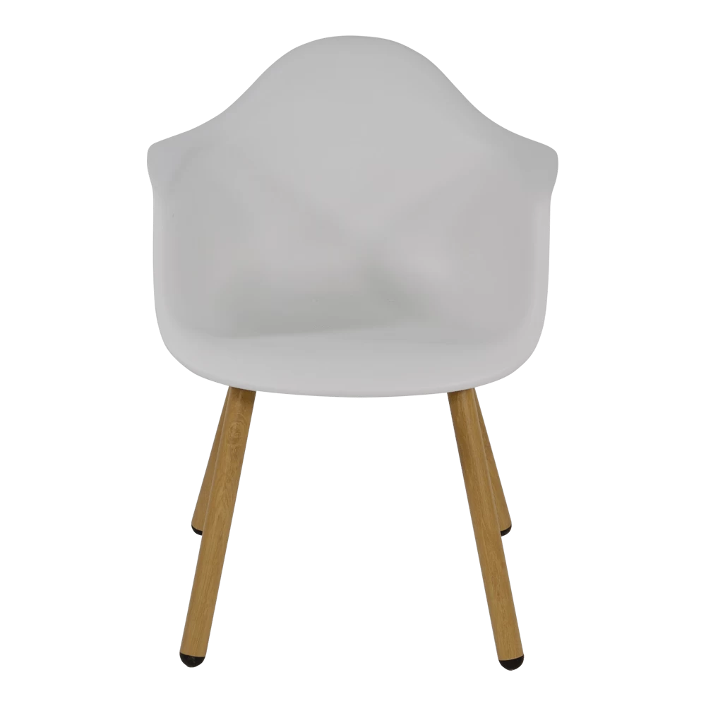 Het onderstel van de stoel heeft een houtlook, maar is vervaardigd uit aluminium. Hierdoor staat het niet alleen mooi, maar is de stoel ook onderhoudsvriendelijk! Het zitgedeelte is gemaakt van kunststof en bevat gaatjes voor de afvoer van (regen)water. Kunststof is sterk, onderhoudsarm en licht in gewicht. Beide materialen zijn zeer geschikt voor buiten.