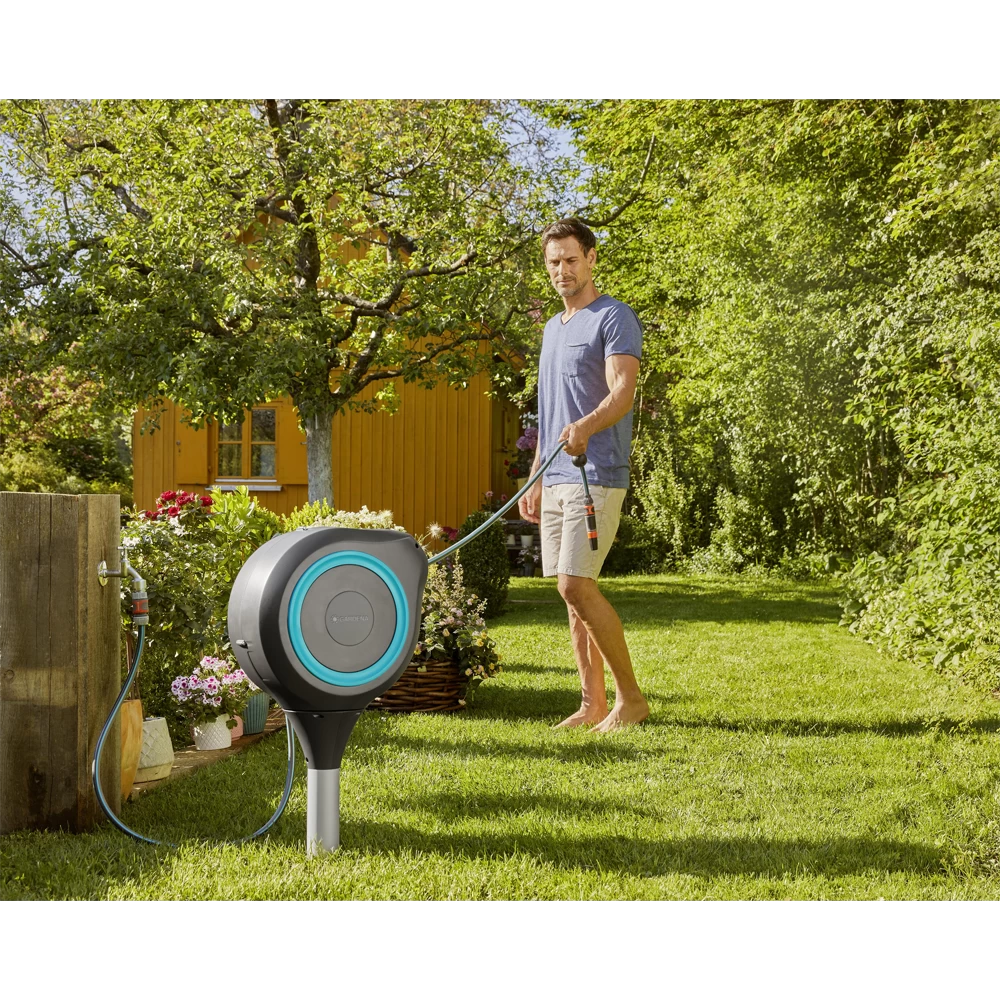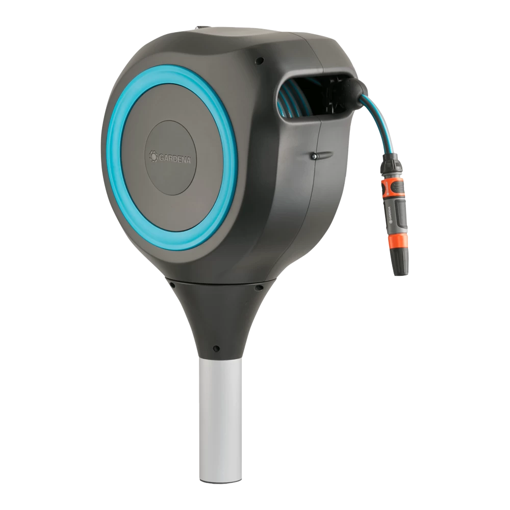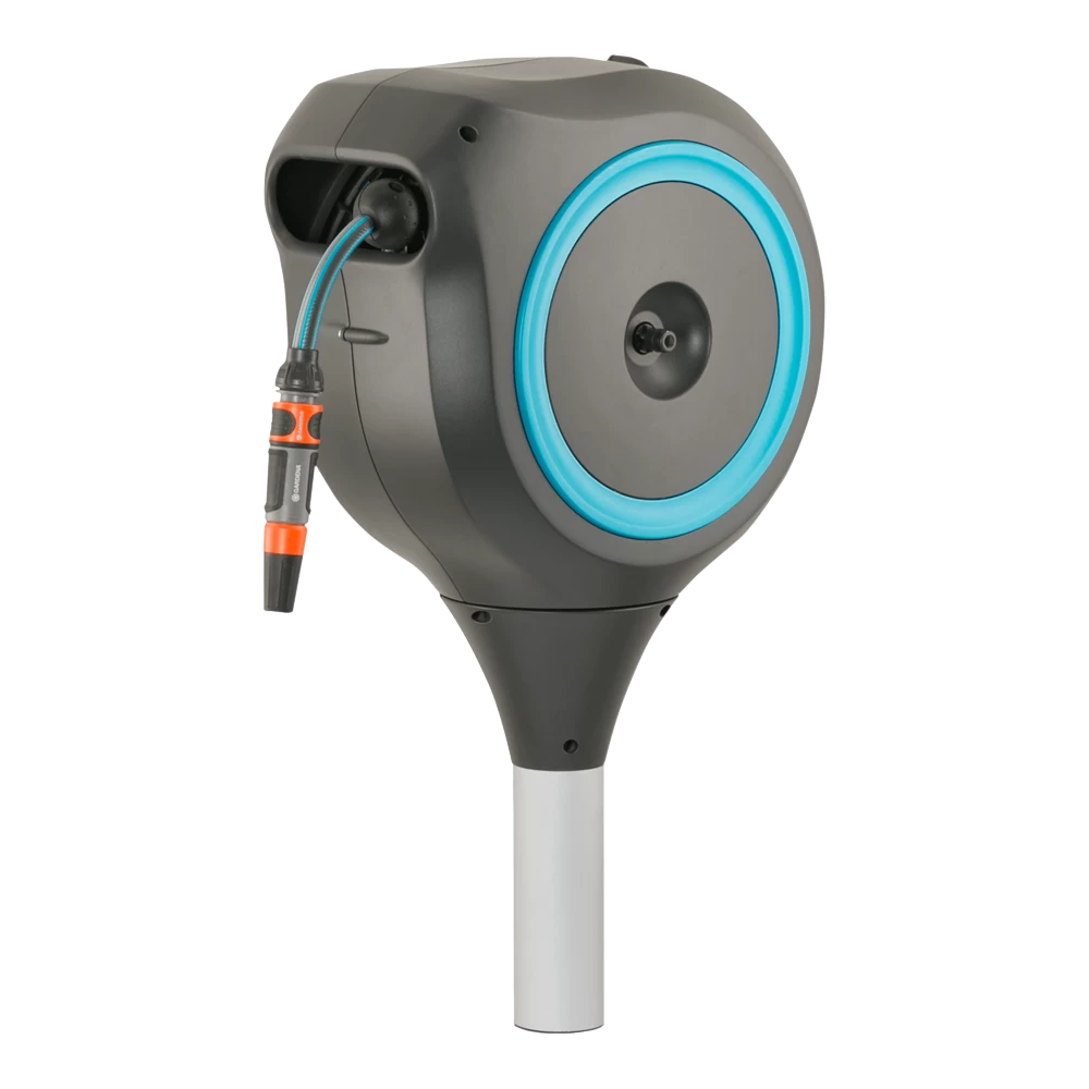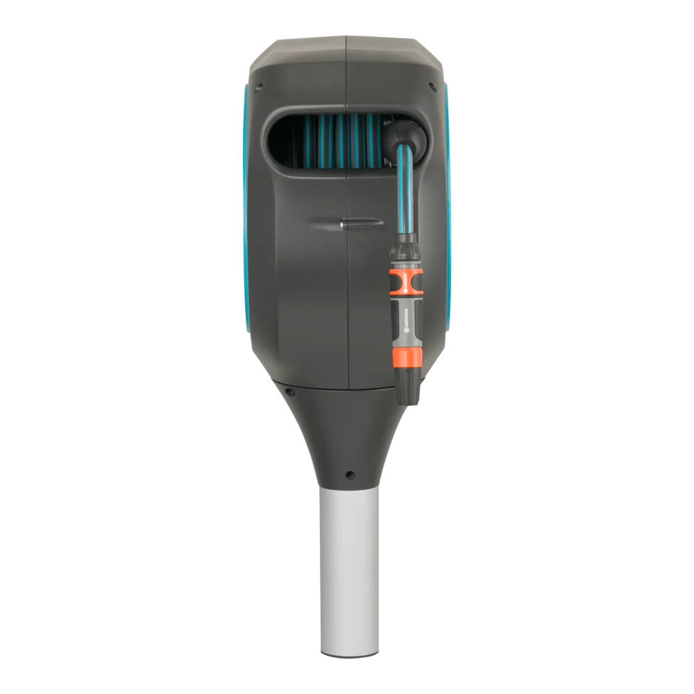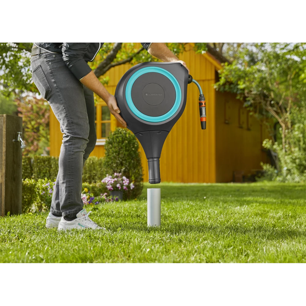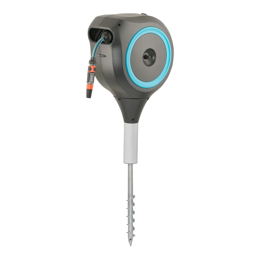 De slangenbox RollUp M van GARDENA biedt niet alleen een veilige en ruimtebesparende opslag voor uw tuinslang, maar u zult ook blij zijn met de moeiteloze bewatering van uw middelgrote tuin. De handige slangenbox wordt in de grond verankerd met een stevige standaard op een plek naar keuze in een bloembed of op het gazon. Met behulp van een bevestigingsstang kunt u de metalen pen nog eenvoudiger in de grond schroeven. Voor gebruik trekt u de 20 meter lange slang uit tot de gewenste lengte en kunt u meteen beginnen met bewateren. Dankzij de ingebouwde korte vergrendelingspunten is het hanteren van de tuinslang eenvoudiger dan ooit: zodra u stopt met de slang, wordt de vergrendeling automatisch vastgezet op de gewenste slanglengte. Het innovatieve ontwerp kan 360 graden worden gedraaid, voor maximale flexibiliteit bij het bewateren van de tuin. De box volgt altijd uw bewegingen, zodat u elke hoek van uw tuin gemakkelijk kunt bereiken zonder dat de tuinslang knikt of in de knoop raakt. Bovendien bespaart u met deze slangenbox vermoeiend opwikkelen en oprollen en hebt u geen last van vuile handen: door kort aan het uiteinde van de slang te trekken, wordt de vergrendeling ontgrendeld en wordt de tuinslang dankzij een geïntegreerde stalen veer volledig automatisch en betrouwbaar opgerold. De box heeft een praktische slanggeleider die de slang op zijn plaats houdt, zodat er geen blokkades of knopen optreden. De innovatieve RollControl-technologie zorgt voor veilig, gecontroleerd en moeiteloos oprollen zonder dat de slang in de war raakt. Het hoogwaardige materiaal is bestand tegen UV en vorst, heeft een lange levensduur en is onderhoudsvrij. De box is zeer compact en stijlvol ontworpen, zodat deze eenvoudig in elke tuin kan worden geïntegreerd. Hij is bovendien afgesteld op de hoogte van de GARDENA robotmaaiers, zodat het gazon rond de slangenbox altijd wordt onderhouden en gemaaid. De slangenbox wordt geleverd met een flexibele aansluitslang, alle benodigde montageonderdelen, de Original GARDENA System elementen en een sproeier met twee verschillende sproeipatronen. GARDENA geeft vijf jaar garantie op de slangenbox RollUp M. Bewatering die altijd gebruiksklaar is.